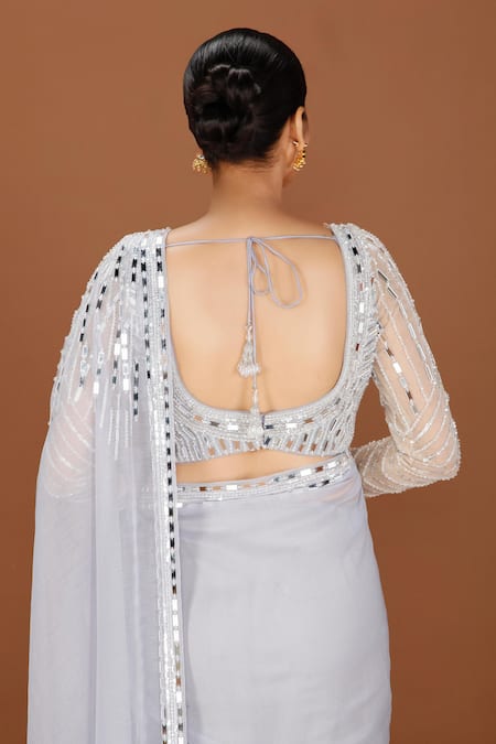 Grey saree featuring intricate mirror, sequin, and bead embroidery. Paired with a padded blouse that has a back tassel tie-up.