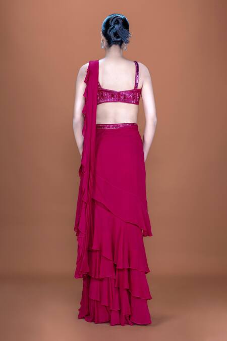 Magenta pre-stitched saree featuring cascading ruffle border. Paired with a padded blouse embellished with sequin, cutdana, bead, and crystal embroidery.