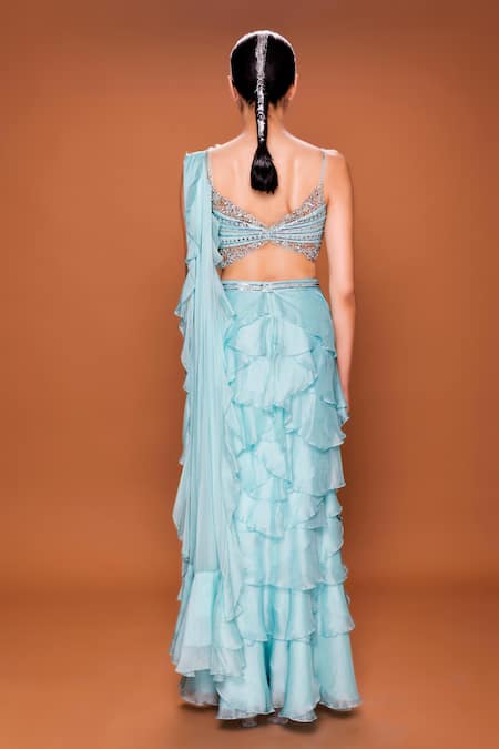 Aquamarine blue pre-stitched saree featuring cascading ruffle border. Paired with a sleeveless embroidered blouse adorned with cutdana, crystal, and sequin work.