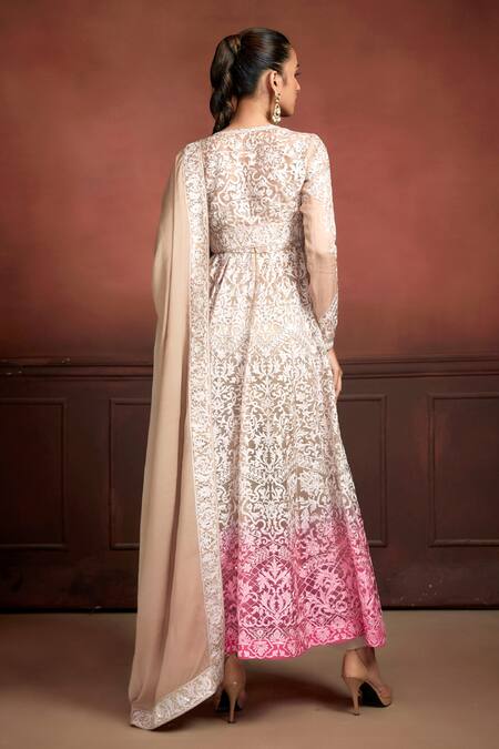 Beige and pink ombre embroidered anarkali featuring a front slit and attached lining. Paired with a front potli opening detachable full sleeve blouse and shaded dupatta with border.