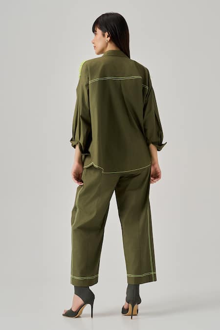 Green Cotton Plain Fringes Collar Cameo Drift Draped Shirt With Pant