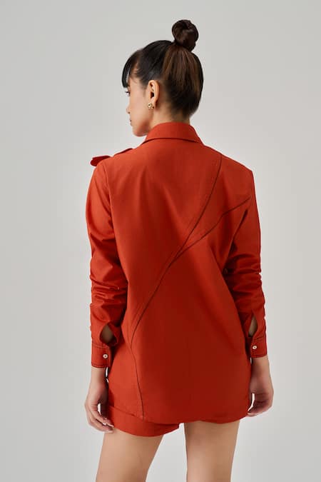 Rust shirt featuring 3D floral embellishments on the shoulders with panel detailing. Paired with matching shorts for a complete look.