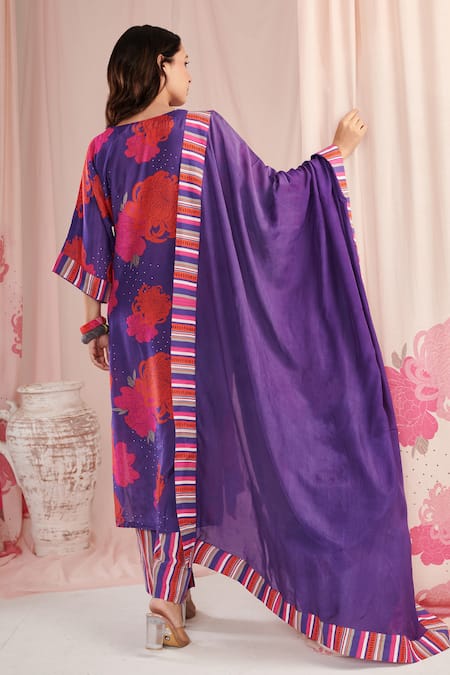 Purple kurta featuring an all-over floral print with a V-neckline and three-quarter sleeves. Paired with matching pant and dupatta, creating a cohesive look.