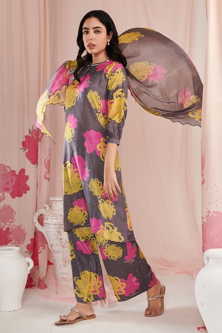Grey Silk, Cotton Embroidery Round Neck Botanical Print Kurta Pant Set