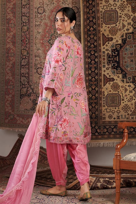 Old rose pink Anarkali featuring bell sleeves and V neckline with hand embroidery. Paired with a solid dhoti pant and scallop hem dupatta.