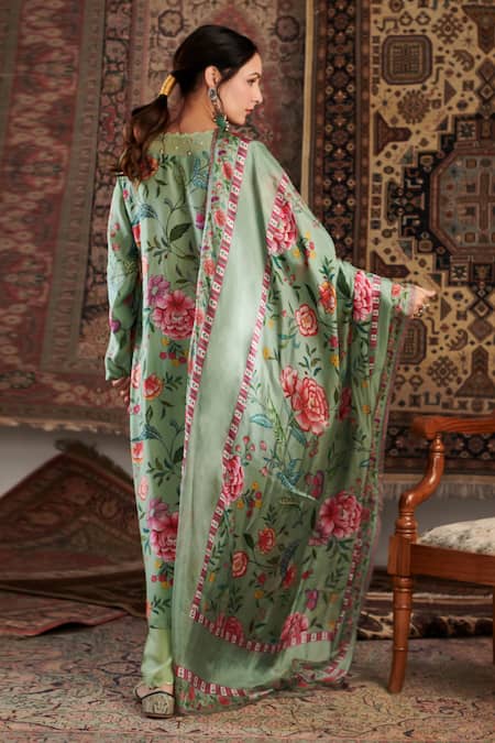 Green kurta featuring floral hand embroidery with pearl and sequin accents on the neckline. Paired with a scalloped hem palazzo and a printed dupatta.