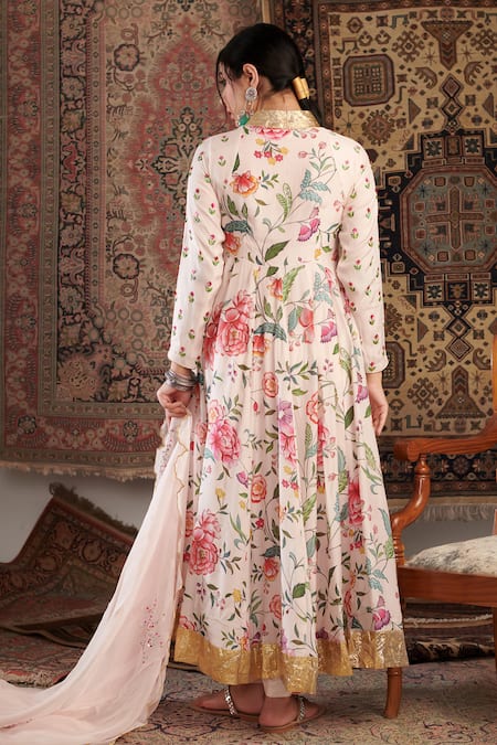 Ivory Anarkali featuring floral pattern with hand embroidery, sequin, and gota lace detailing. Paired with a churidar and a scallop hem embroidered dupatta.