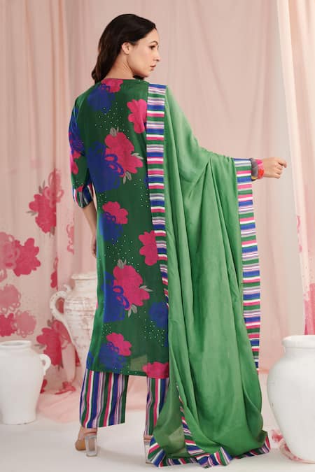 Green kurta featuring an all-over floral print with a V-neckline and three-quarter sleeves. Paired with a matching pant and a coordinating dupatta.
