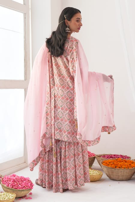 Powder pink floral print kurta with potli detail. Paired with printed sharara and dupatta.