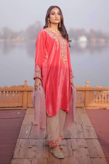 Red Velvet Pearl, Sequin And Zari Work Notched Round Neck Phiran & Salwar Set