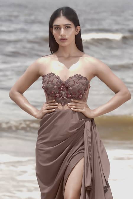 Brown Crepe Lining Shantoon Embroidery Aari Off Florence Draped Corset Dress