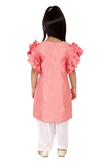 Baby pink embroidered chanderi straight kurta with white leaves motifs and layered ruffle sleeves. Paired with a salwar for a complete look.