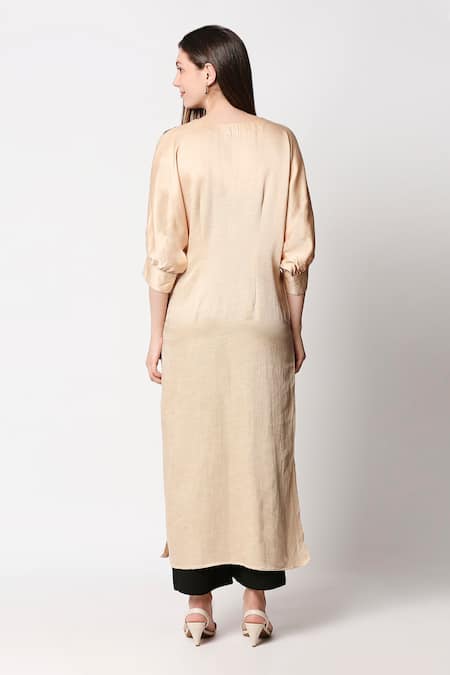Beige Kurta-satin Linen, Pants-viscose Rayon V Neck Embroidered Kurta With Pants