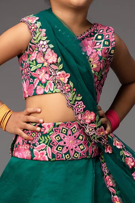 Emerald green lehenga featuring floral embroidery and cutwork hem. Paired with an embroidered round neckline blouse and a net dupatta.