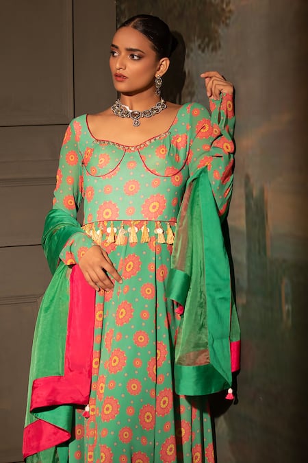 Green anarkali featuring a botanical print with mirror, thread, pearl, bead, and gota embroidery. Paired with a tassel bordered sheer dupatta.