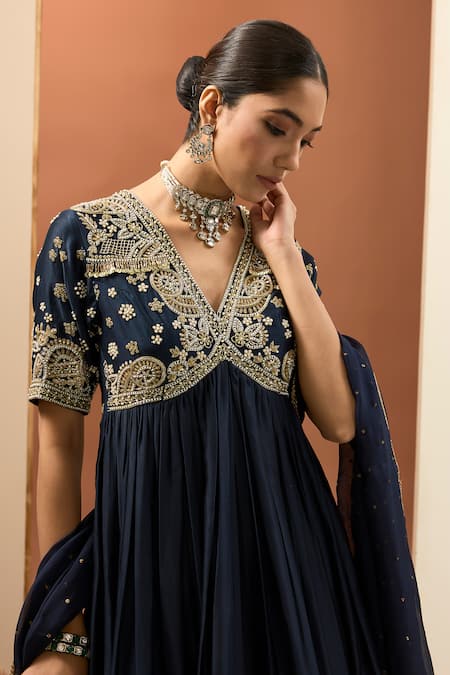 Blue anarkali featuring a V neck, half sleeves, and a relaxed fit. Paired with a dupatta showcasing scattered butti work.