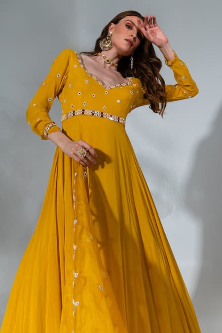 Yellow anarkali featuring a sweetheart neckline with long sleeves, adorned with mirror and thread embroidery. Paired with a matching organza dupatta, enhancing the overall elegance.
