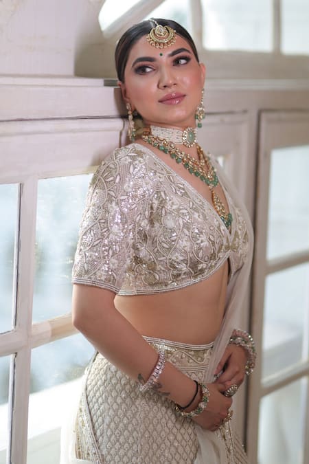 Ivory lehenga featuring intricate embroidery in cutdana, pearl moti, sequins, and dabka work. Paired with an embroidered padded blouse and dupatta, designed for a bridal look.