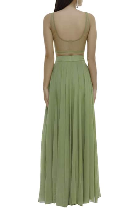Green Tulle, Chiffon Organza Floral Jaal Motif Leaf Flared Lehenga Set