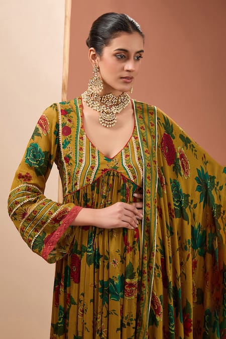Mustard floral print anarkali featuring a plunging V neck and long sleeves. Paired with a coordinating printed pant and dupatta.