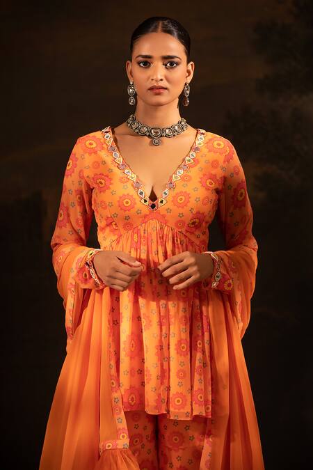 Tangerine floral print kurta featuring a plunge V neck and full sleeves. Paired with a gharara and sheer dupatta with pleated frill hem.