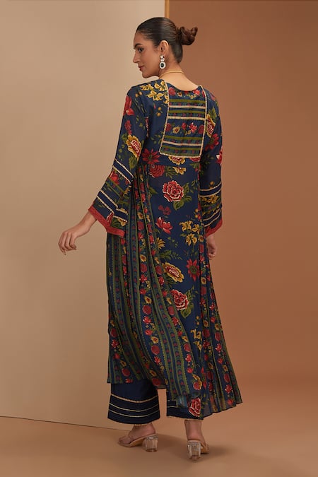 Blue anarkali featuring floral and stripe print with gota work. Paired with straight pant and printed bordered dupatta.