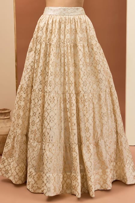 Ivory Chanderi Silk, Organza Beads, Zari, Geometric Banarasi Pattern Lehenga Set
