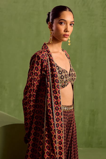 Black long jacket featuring geometric motif prints paired with an inner padded blouse adorned with mirror, gold zari, and sequin work. It includes a sharara with all-over motif prints.