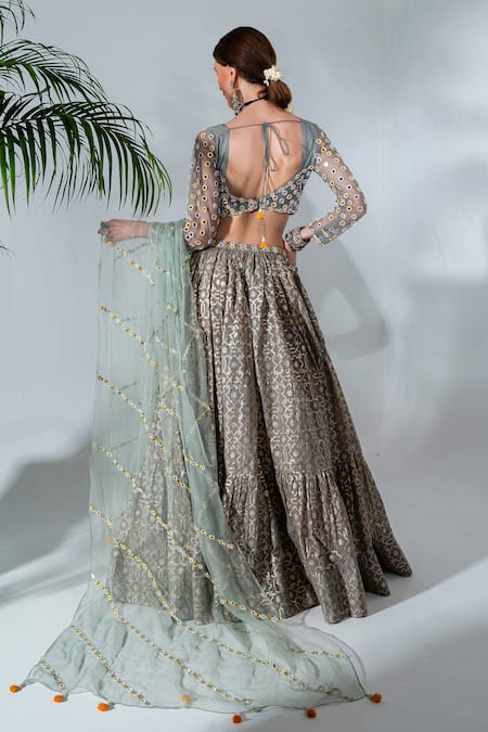 Mirrorwork detailing on blouse, Cutdana work on lehenga, Floral thread embroidery accents