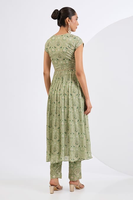 Green Anarkali featuring hand embroidery with katdana, mirror, and pearl beads. Paired with matching pant and dupatta in viscose chinon fabric.