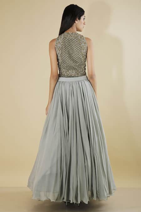 Grey flared skirt featuring a pleated silhouette. Paired with a nalki embroidered bodysuit with French wire work and jewel neck design.