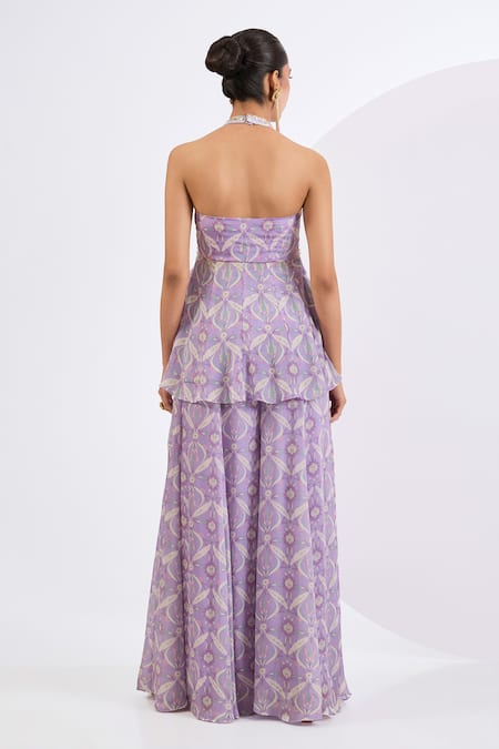 Lilac kurta featuring a mosaic print with pearl, katdana, mirror, and bead embroidery. Paired with a matching sharara and dupatta in viscose chinon fabric.