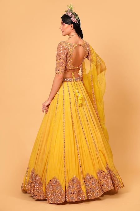 Yellow tulle lehenga with mirror, zari sequin embroidery. Comes with embroidered blouse & dupatta.