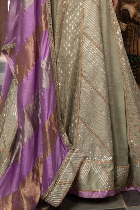 Green lehenga set featuring a mirror and zardozi work. Includes a matching blouse and dupatta in pure organza and tissue chanderi.