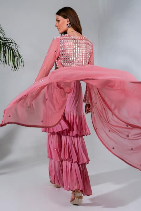 Buy_Neha Khullar_Pink Georgette Mirrors, Embroidery V-, Open Jacket And Gharara Set _Online_at_Aza_Fashions