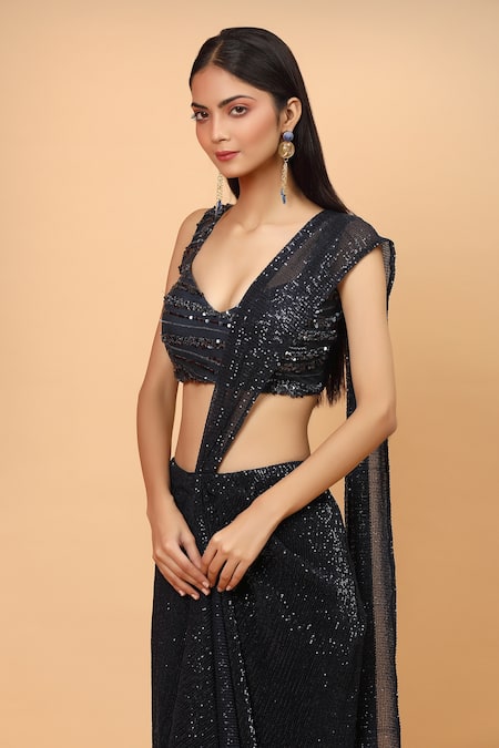 Navy blue pre-draped saree with sequin embroidery all over. Paired with embroidered blouse.