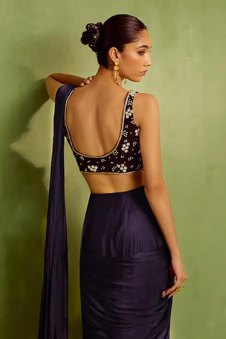 Black pre-draped saree paired with a padded blouse featuring floral hand embroidery with dabka, beads, and sequin work. The blouse has a scoop neckline and is sleeveless, providing a modern fusion look.