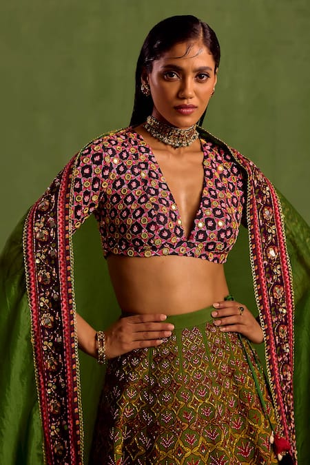 Green lehenga featuring all over quatrefoil prints and hand embroidery with cutdana and beads. Paired with a padded blouse adorned with sequin and mirror embroidery, along with an embroidered dupatta.