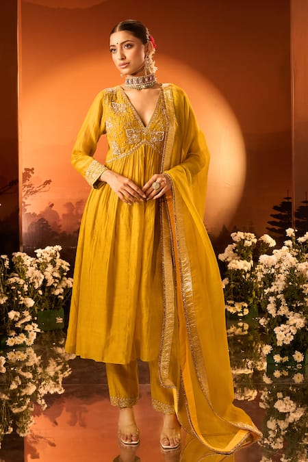 Yellow Anarkali set featuring a deep V-neck and intricate embroidery. Paired with matching pant and a lightweight organza dupatta.