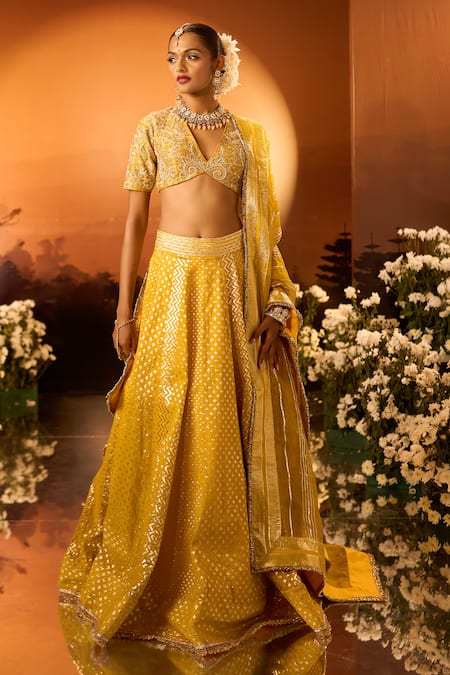 Yellow lehenga made from Banarasi chanderi featuring an attached cancan. Set includes a padded blouse in viscose raw silk and an organza dupatta.
