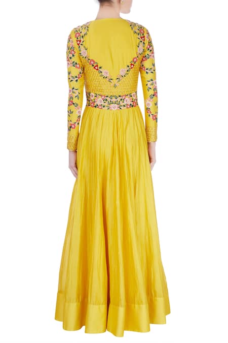 A yellow floor-length anarkali dress featuring beautiful floral embroidery and sequin embellishments. It is teamed with a net dupatta.
