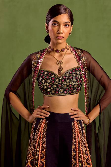 Black sharara set featuring a padded blouse with geometric print and bead embellishments. Paired with an open cape adorned with asymmetric zari embroidery and mirrorwork.