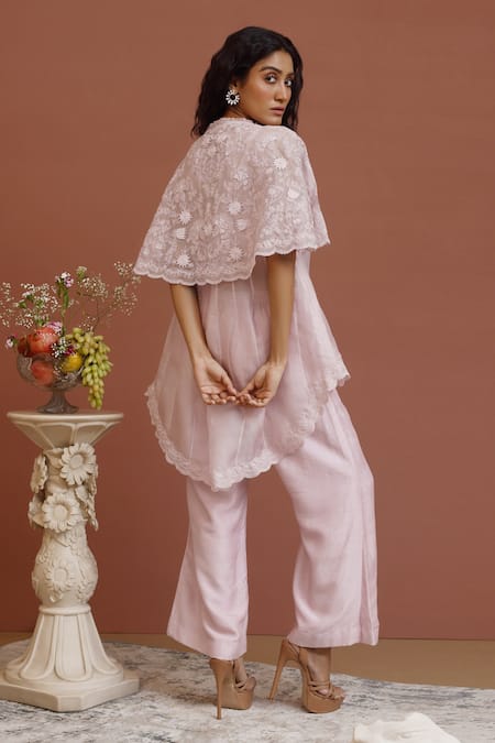 Purple embellished cape featuring bead and thread work with scallop high-low hem. Paired with a matching silk bustier and pant with semi-elasticated waistband.