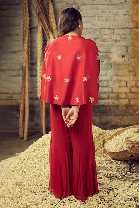 Cherry red cape with all-over floral embroidery and cutwork detail. Comes with sharara, crop top and embroidered belt.