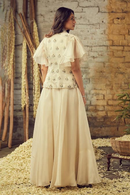 Ivory jacket with floral embroidered motifs and ruffle sleeves. Comes with crop top and sharara.
