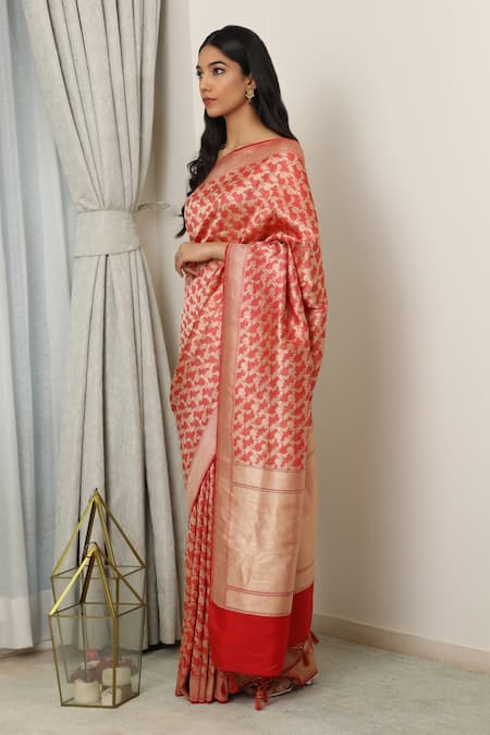 Red Banarasi saree featuring zari woven jaal patterns and a checkered pattern border