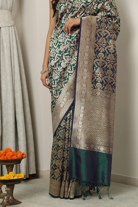 Green banarasi saree featuring zari woven floral jaal motifs and a blossom pattern border