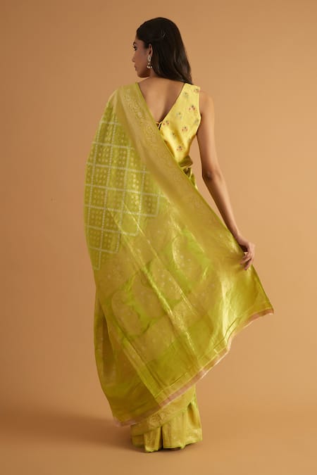 Green banarasi silk saree featuring an all-over trellis and floral butti pattern