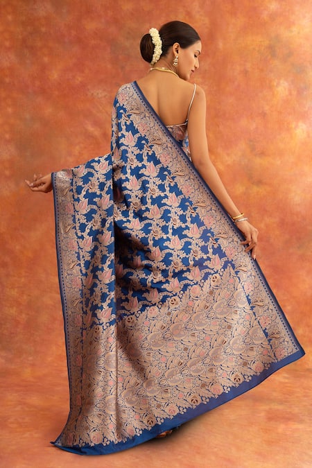 Blue Silk Embroidery Morning Glory Handwoven Saree With Running Blouse