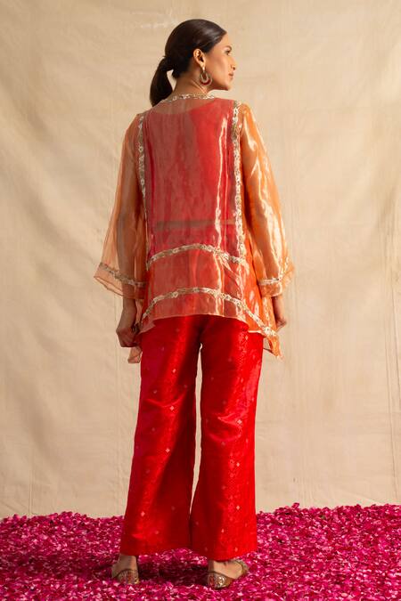 Red Silk, Brocade, Cotton Embroidery, Beads V-neck Mugdha Sheer Top With Pant